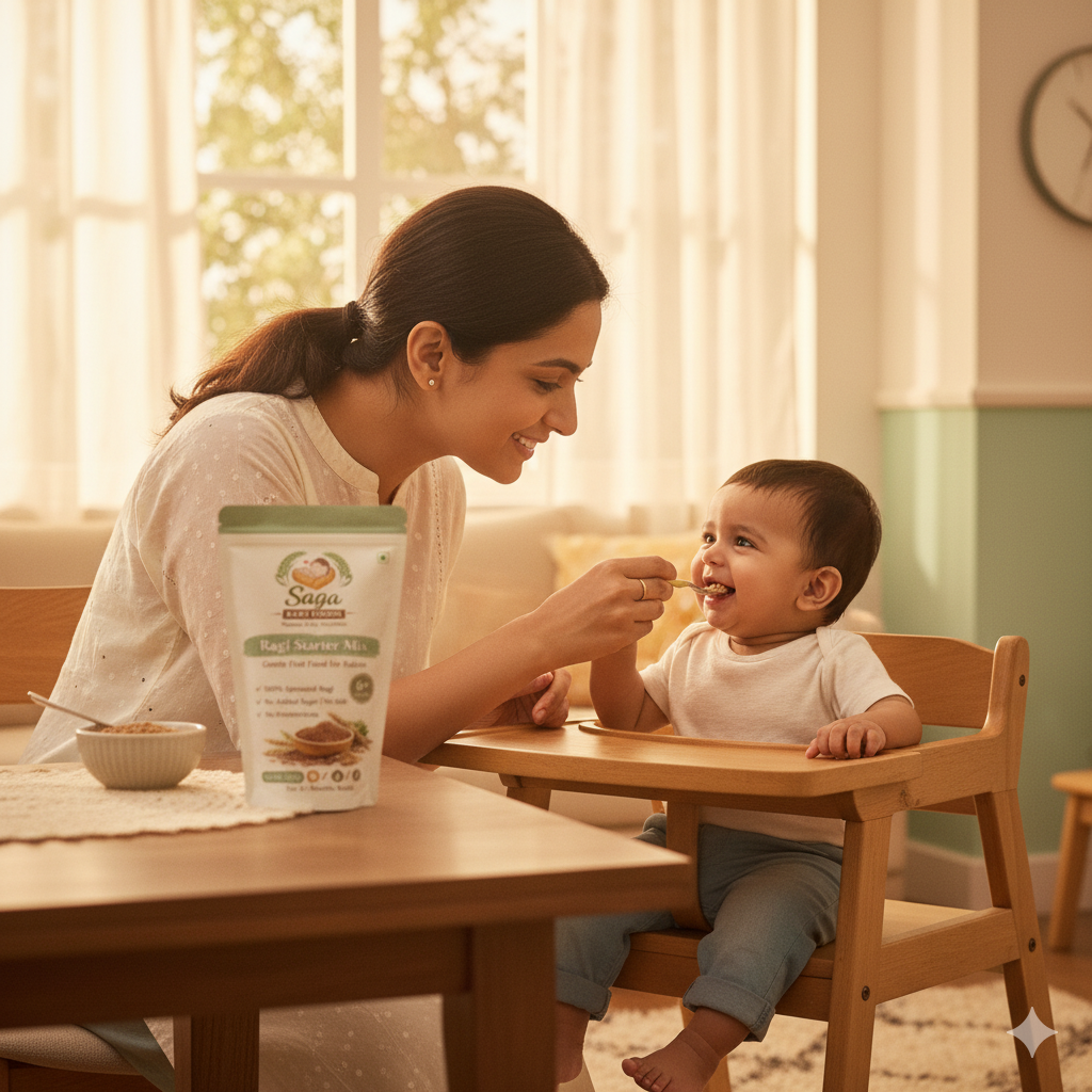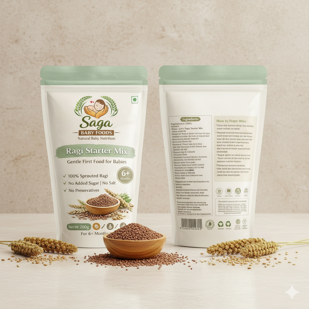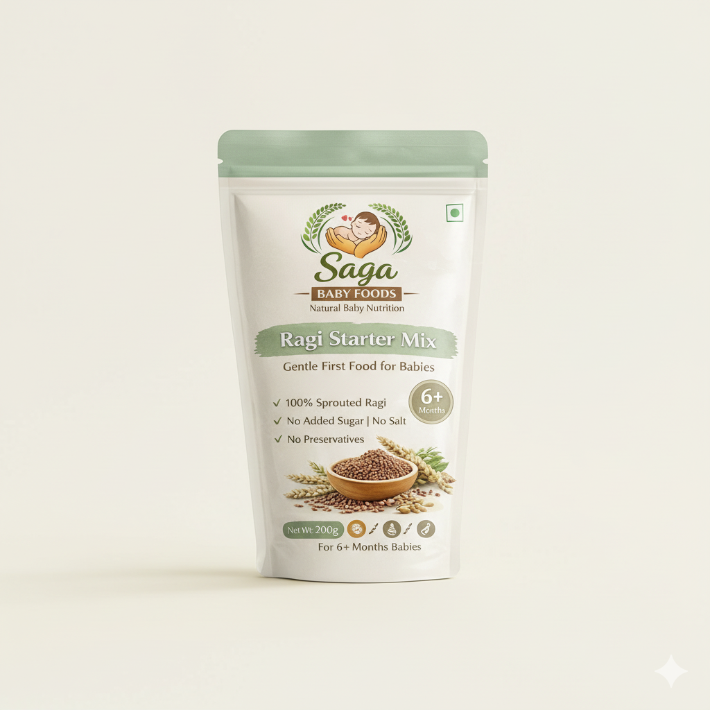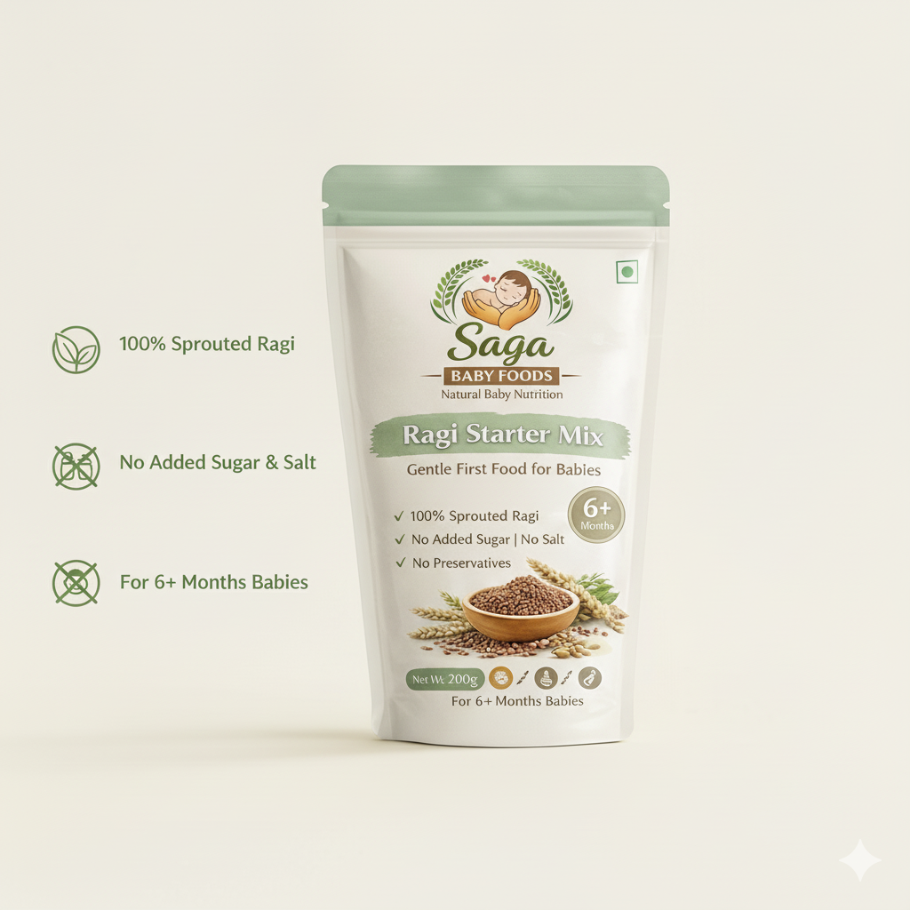 SAGA Baby Health Mix is made with carefully selected grains, pulses, and nuts to support healthy growth and digestion in babies. No added sugar, salt, or preservatives.